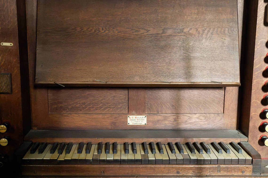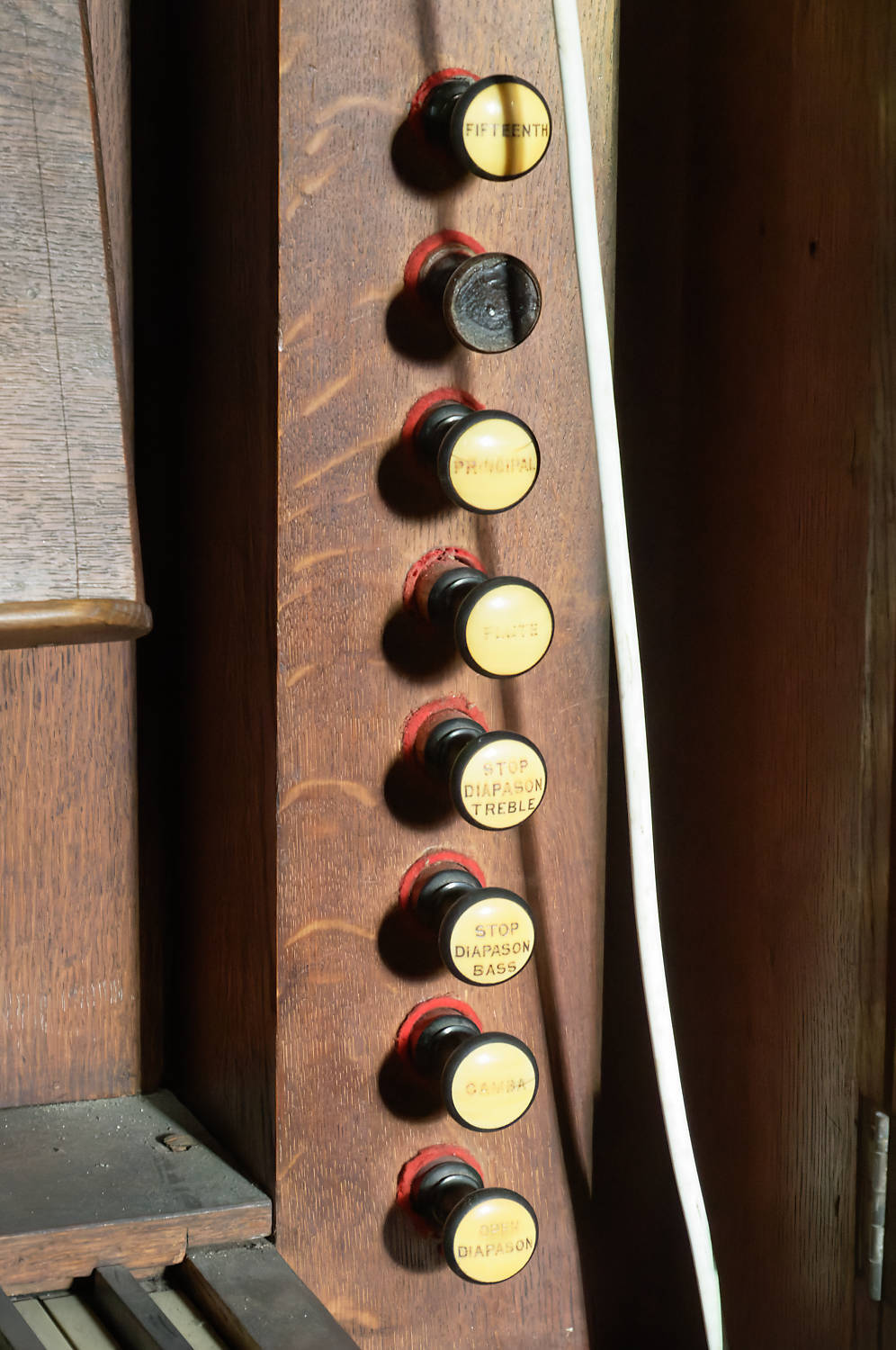 The mechanism behind the keyboard (parts of which can be seen) is in a parlous state, and probably was before the church was deconsecrated. There were two ciphers (sticking notes) whilst I was playing – one permanent and one intermittent – with the likelihood of several more if the instrument was played regularly. This effectively makes the organ unusable at the present time.