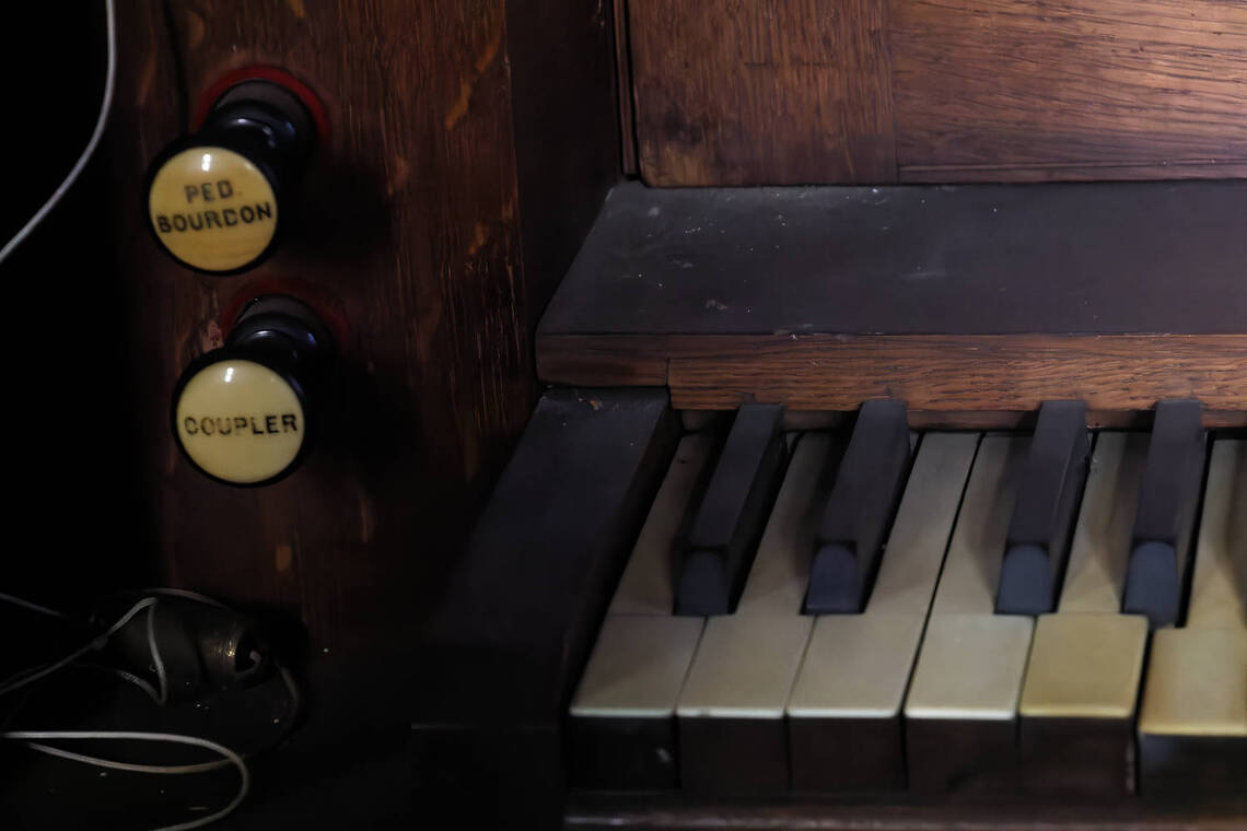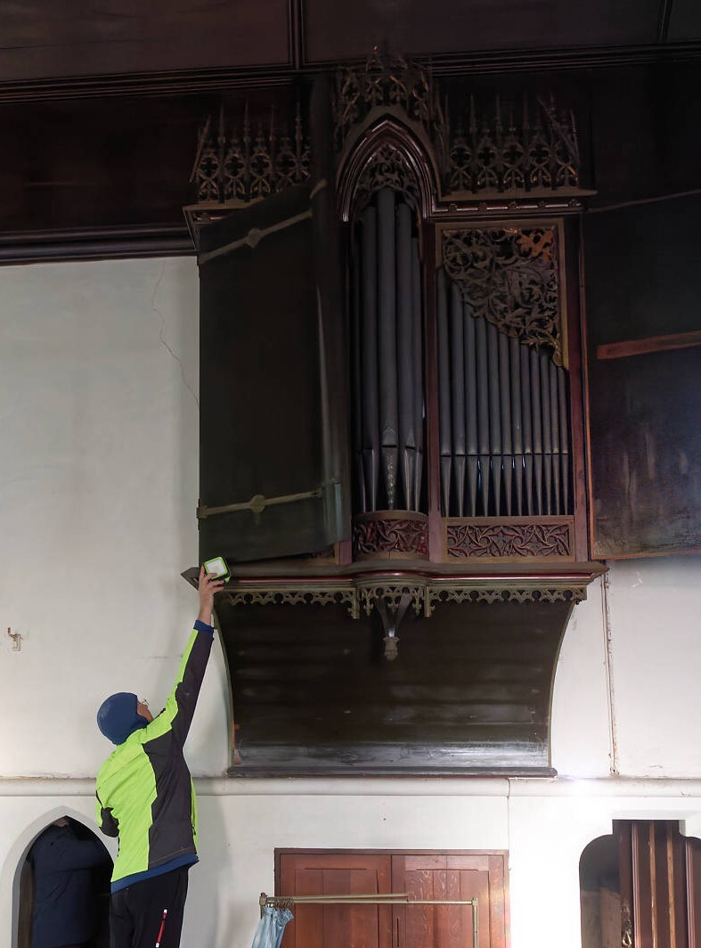There have been two conservative restorations, in 1892 and 1925. Though it seems to have been electrified in the 1950s, as there is no electricity in the building at the moment, to be played, someone needs to climb into the organ loft and handpump the bellows. This also means that the organ is not in the best of conditions. Local musician Simon Brown very kindly tested out the organ and provided us with the following report:
